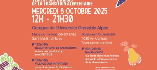 - De 19h à 21h30 – Table-ronde « La Santé dans mon Assiette : ensemble interrogeons nos choix alimentaires» à Sciences Po Grenoble. Nous y explorerons les liens entre alimentation, santé et environnement à travers les interventions et témoignages de :